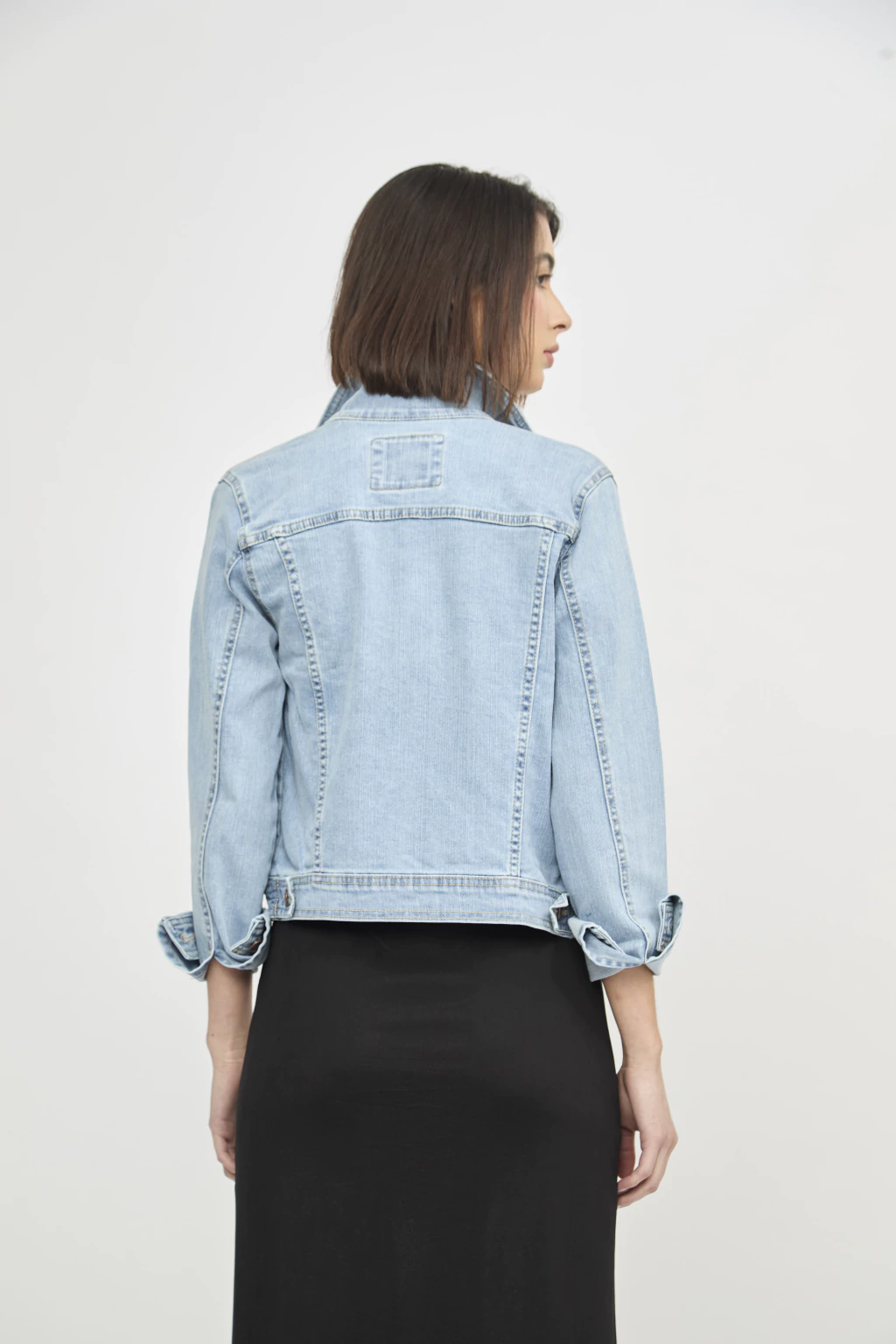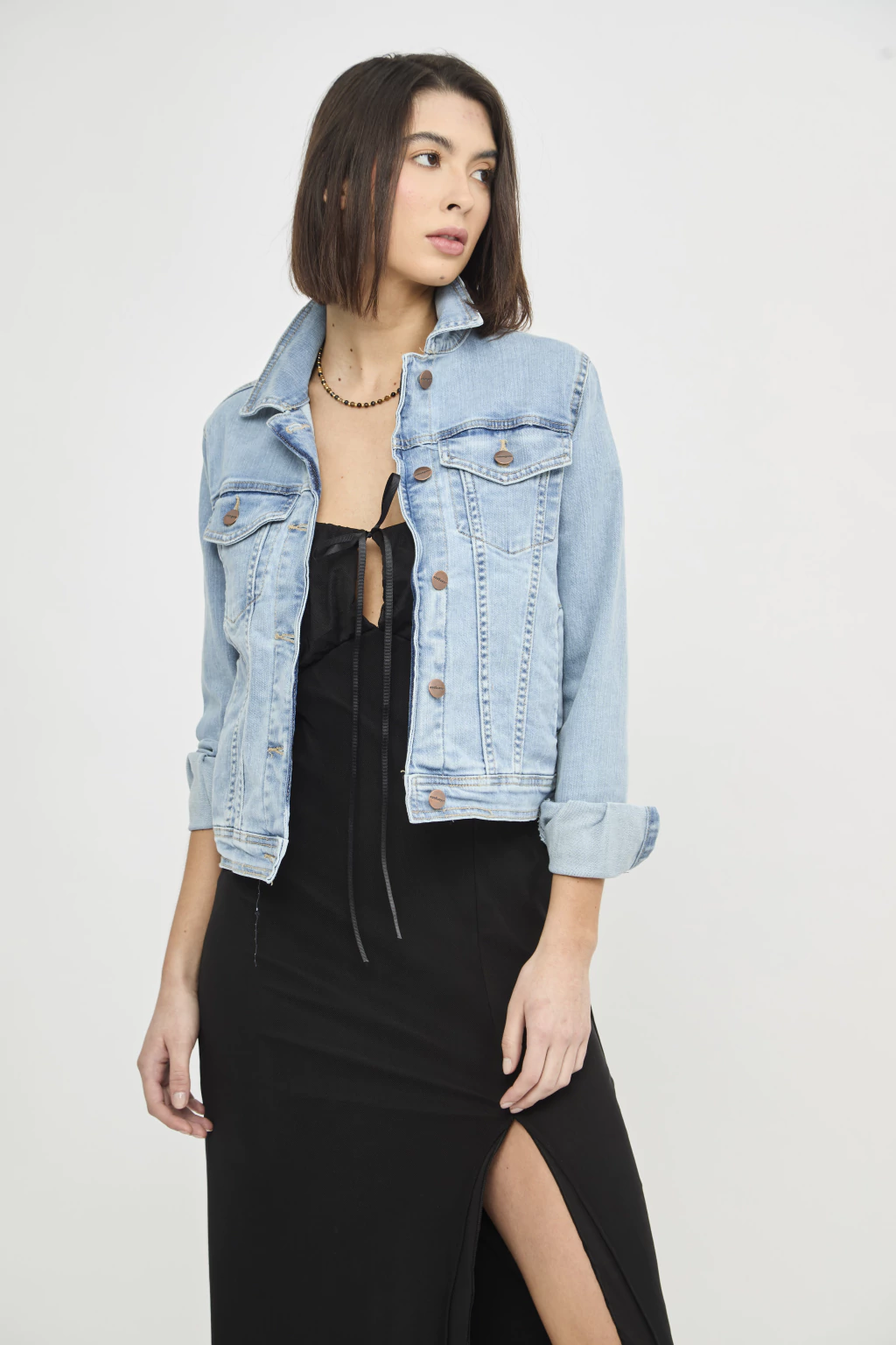 Campera skinny confort de corte recto confeccionado en denim algodón/elastano. Posee recortes delanteros y traseros con bolsillos ojales laterales y bolsillos delanteros con tapa. Posee botones metálicos en cartera y puños. Lavado celeste con efecto de localizado sutil en delantero y trasero.