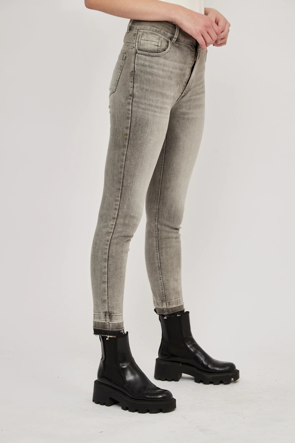 Jeans de corte skinny, tiro alto, elastizado que acompaña la silueta del cuerpo, confeccionado en denim algodón /elastano negro. Acceso a través de cierre y botón, posee bolsillos en delantero y bolsillos plaque traseros, largo hasta tobillo con detalle en botamanga. Lavado gris claro con localizado sutil y laser.