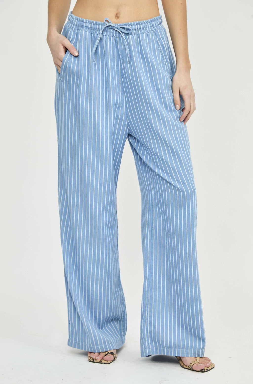 Jean de corte Straight, tiro alto, acompaña el cuerpo desde la cadera y se va haciendo holgado y recto hasta los tobillos . Confeccionado en denim liviano 100% algodón azul y blanco rayado. Posee bolsillos ojales laterales , acceso a través de cintura con elástico con lazo. Lavado con efecto suavizado.